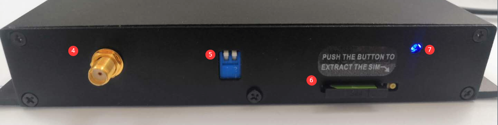 ①电源接口 ②USB 接口 ③接线端子 ④天线接口 ⑤拨码开关 ⑥SIM卡槽 ⑦信号指示灯